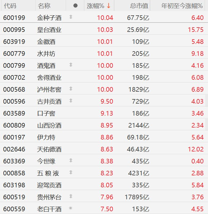 股市场白酒股午后涨幅进一步扩大,其中,泸州老窖、酒鬼酒(56.85 +10.00%)涨超6%,古井贡酒涨近6%,舍得酒业、贵州茅台、水井坊、金徽酒涨超4%,山西汾酒、皇台酒业涨超3%。