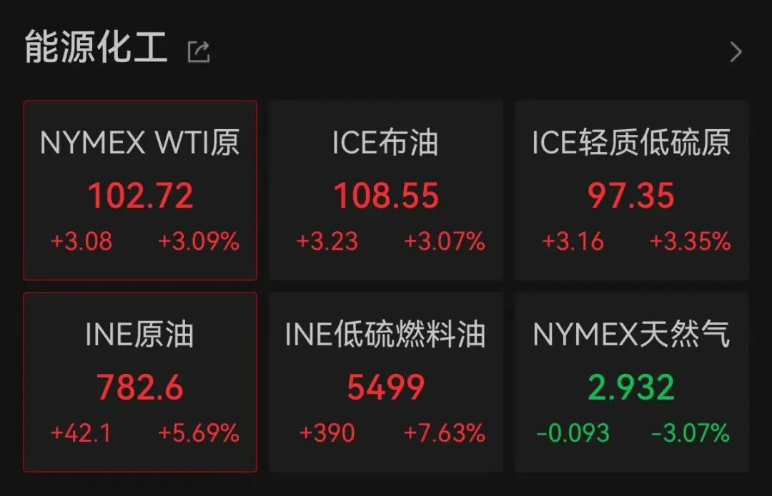 国际油价持续上涨。数据显示,截至北京时间9:32,NYMEX WTI原油期货主力合约上涨3.09%,报102.72美元/桶;ICE布伦特原油期货主力合约上涨3.07%,报108.55美元/桶。据新华社报道,伦敦布伦特原油期货价格盘中突破每桶116美元,逼近美以伊战事爆发以来的盘中最高纪录。