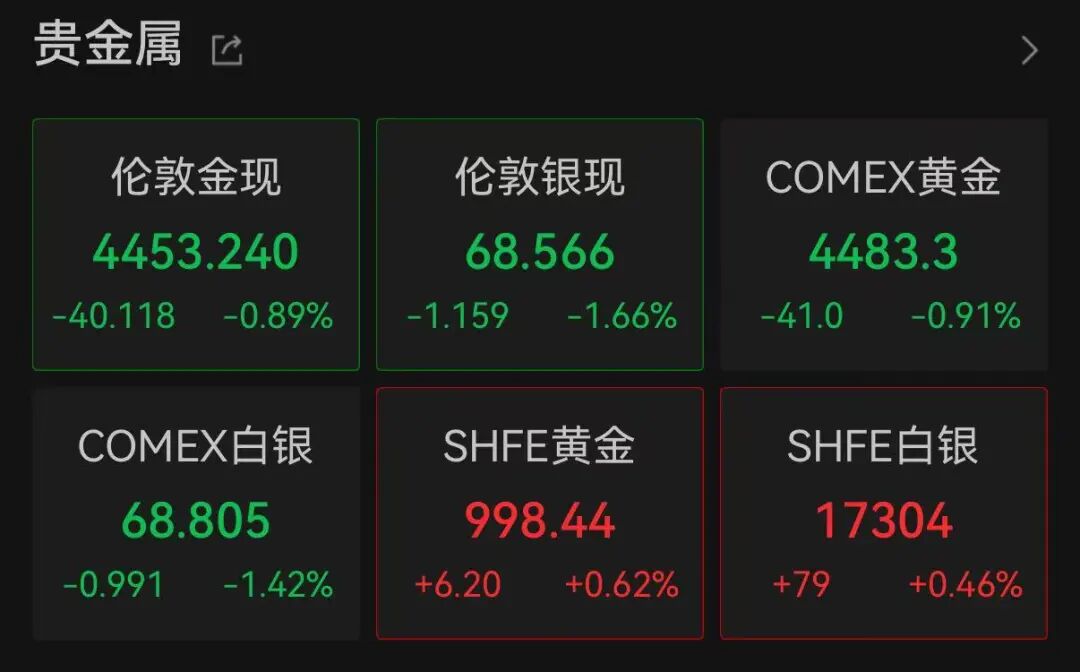 国际贵金属市场集体下跌。数据显示,截至北京时间9:32,伦敦现货黄金跌0.89%,报4453.24美元/盎司;COMEX黄金期货下跌0.91%,报4483.3美元/盎司;伦敦现货白银跌1.66%,报68.566美元/盎司;COMEX白银期货下跌1.42%,报68.805美元/盎司。