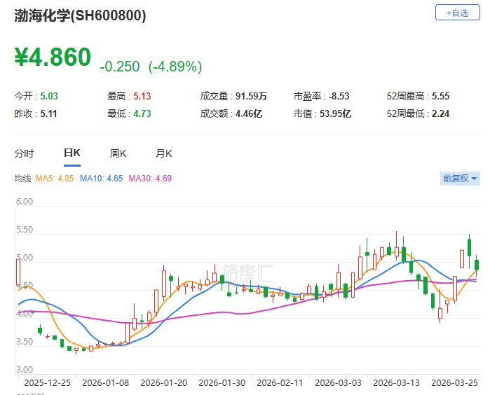 渤海化学(4.89 -4.31%)(600800.SH)现跌4.89%报4.86元,最新市值54亿元。渤海化学公布,2025年度,公司实现营业收入33.3亿元,较上年同期减少30.39%;实现利润总额-64,483.17万元,较上年同期增亏1,307.52万元;实现归属于上市公司股东的净利润-64,634.23万元,较上年同期增亏1,419.93万元。