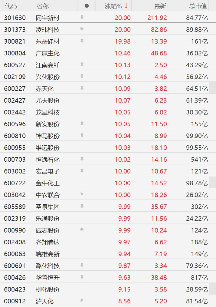 A股市场化工股掀涨停潮,同宇新材、凌玮科技、东岳硅材20CM涨停,广康生化(47.59 +7.99%)涨超10%,江南高纤、兴化股份、赤天化、尤夫股份、龙星科技、新安股份、神马股份、维远股份、恒逸石化、宏昌电子、金牛化工、中农联合、圣泉集团、乐通股份、诚志股份、齐翔腾达、皖维高新10CM涨停,潞化科技、华鲁恒升、柳化股份逼近涨停。