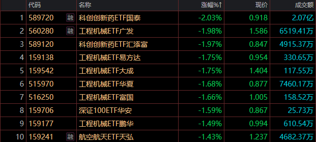 科创创新药ETF(589720)领跌2.03%,工程机械ETF(560280)跌1.98%,科创创新药ETF(589120)跌1.97%。