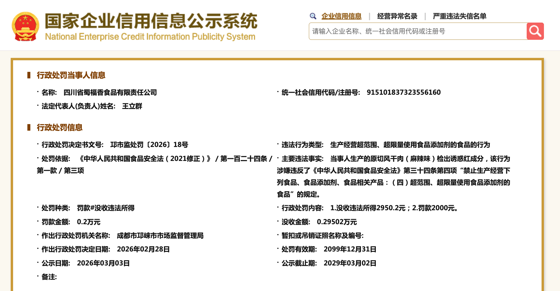 国家企业信用信息公示系统显示,今年2月,四川省蜀福香食品有限责任公司,因生产经营超范围、超限量使用食品添加剂的食品的行为,被成都市邛崃市市场监督管理局没收违法所得2950.2元,并罚款2000元。主要违法事实显示,该公司生产的原切风干肉(麻辣味)检出诱惑红成分,涉嫌违反食品安全法。