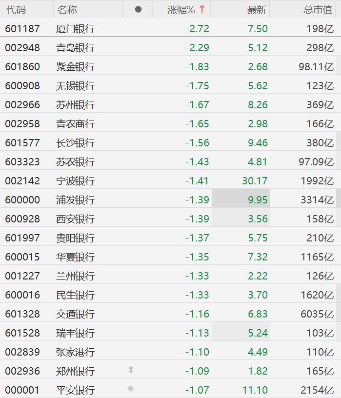 A股市场银行股普跌,其中,厦门银行、青岛银行(5.12 -2.29%)跌超2%,紫金银行、无锡银行、苏州银行、青农商行、长沙银行、苏农银行、宁波银行、浦发银行、交通银行跌超1%。