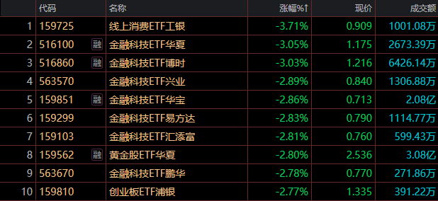 线上消费ETF(159725)领跌3.71%,金融科技ETF(516100)跌3.05%,金融科技ETF(516860)跌3.03%。
