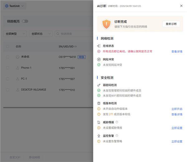 同时,蒲公英管理平台还提供一键 AI 诊断功能,从在线成员、网络冲突、访问策略,到弱密码、威胁情报与告警策略,系统会自动完成检测、分析与汇总,并以清晰的状态结果呈现给管理员。