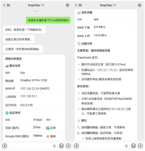 OrayClaw 就可以自动调用相关能力,对当前设备列表、流量占用、延迟、丢包、DNS 响应等情况进行综合诊断,并将结果以更直观的方式反馈。