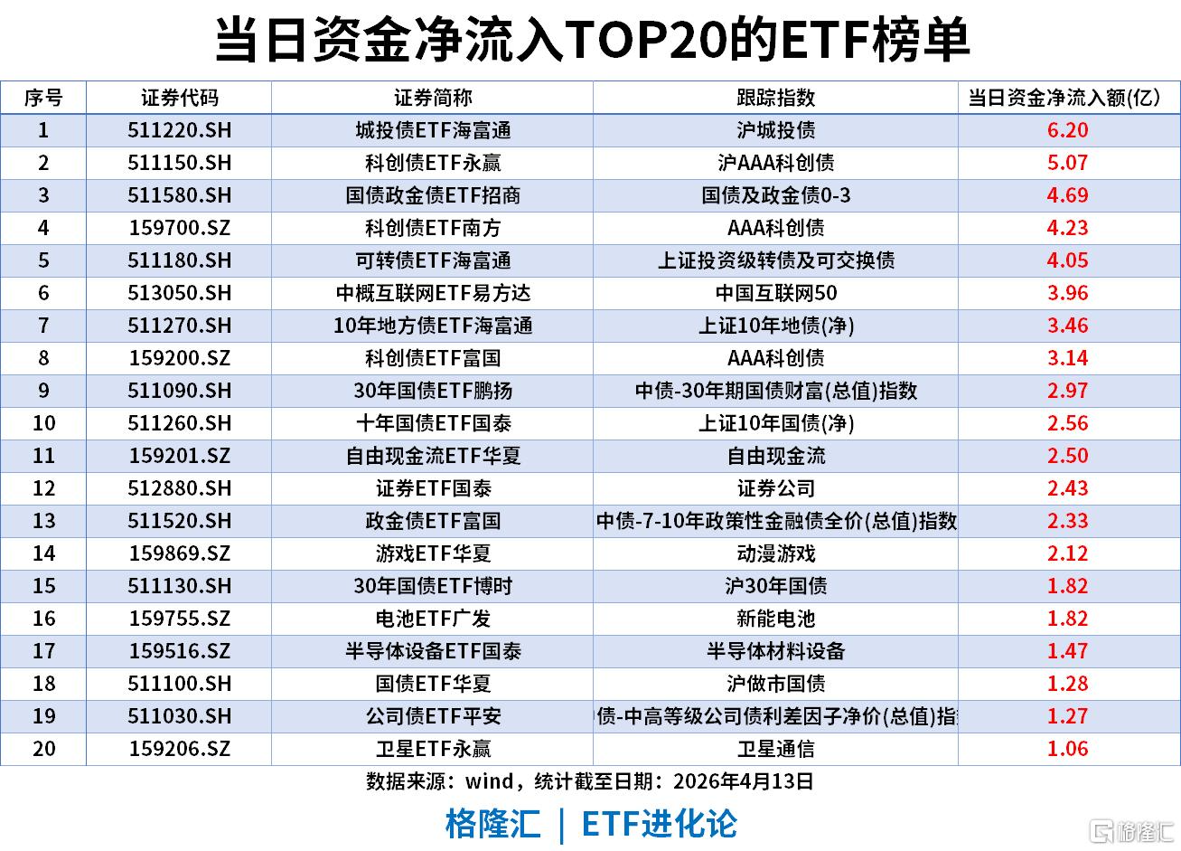 当日资金呈现固收类资产绝对主导的格局,低风险债类成为资金核心避风港:城投债ETF海富通以6.20亿净流入领跑。