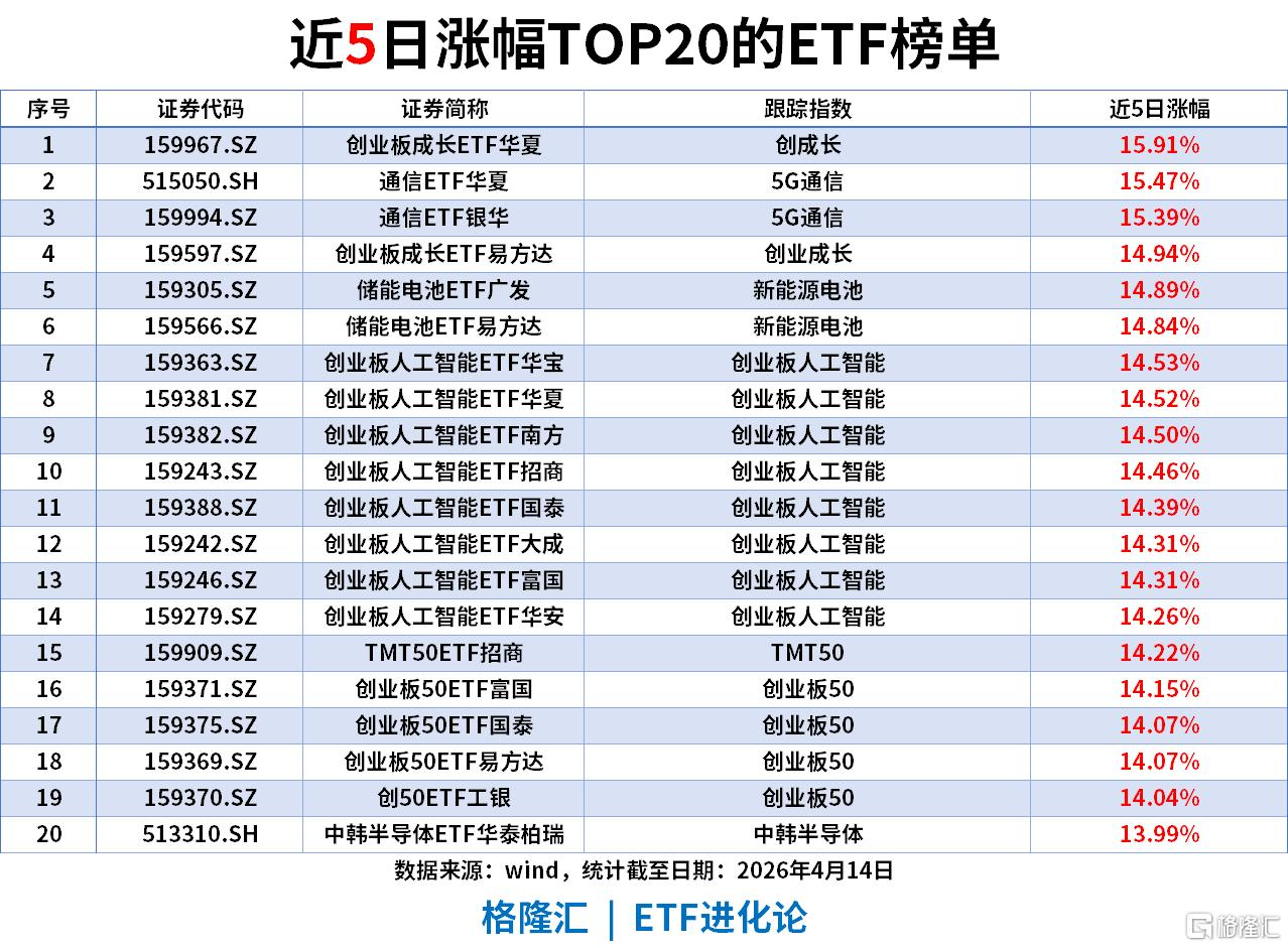 科技成长赛道全线霸榜,创业板成长与人工智能形成双主线共振领涨。创业板成长ETF华夏以15.91%涨幅领跑,通信ETF华夏、通信ETF银华同期涨超15%。