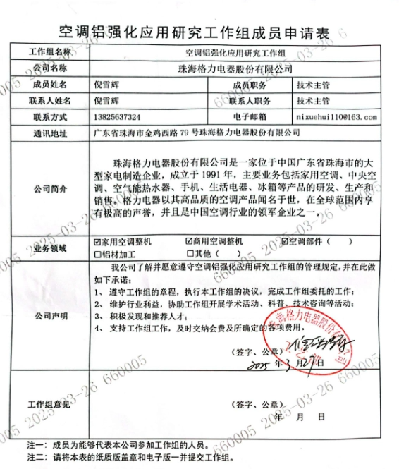 随后,海信空调品牌总监杨祥玺转发朱磊微博表示“又当又立”,并附上了一张《空调铝强化应用研究工作组成员申请表》的扫描件,该申请表的公司一栏为格力电器。