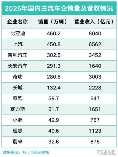 从营收维度来看,头部车企的规模优势进一步凸显。比亚迪(102.91 -0.84%)以8040亿元的营收规模稳居行业榜首,上汽、吉利、长安、奇瑞依次位列第二至五位。这背后,离不开销量的稳健增长。2025年,比亚迪销量达460.2万辆,连续多年保持高增长态势。上汽集团、吉利汽车、长安汽车、奇瑞汽车分别以450.8万辆、302.5万辆、291.3万辆、280.6万辆紧随其后。