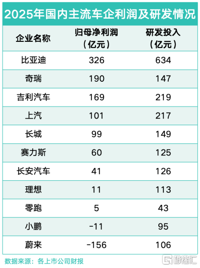 研发投入的差距,成为头部车企竞争力分化的"胜负手"。2025年,比亚迪研发投入达634亿元,同比增长17%;吉利、上汽、长城、奇瑞研发投入分别为219亿元、217亿元、149亿元、147亿元,分列第二至五位。值得注意的是,比亚迪一家的研发投入,已超过吉利、长城、奇瑞三家企业的研发投入之和。