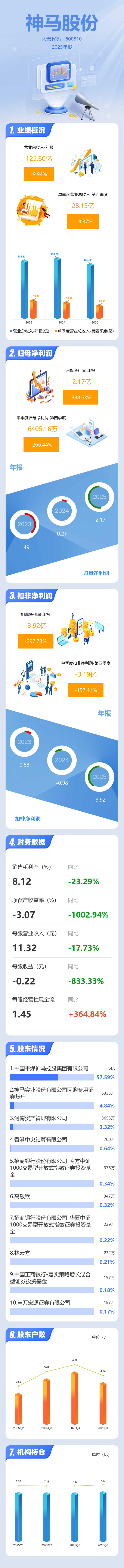 神马股份(8.61 0.00)2025年年报显示,当年度公司主营收入125.8亿元,同比下降9.94%;归母净利润-2.17亿元,同比下降888.63%;扣非净利润-3.92亿元,同比下降297.79%;其中2025年第四季度,公司单季度主营收入28.15亿元,同比下降19.38%;单季度归母净利润-6405.16万元,同比下降266.44%;单季度扣非净利润-3.19亿元,同比下降197.42%;负债率58.57%,投资收益-1.16亿元,财务费用1.21亿元,毛利率8.12%。
