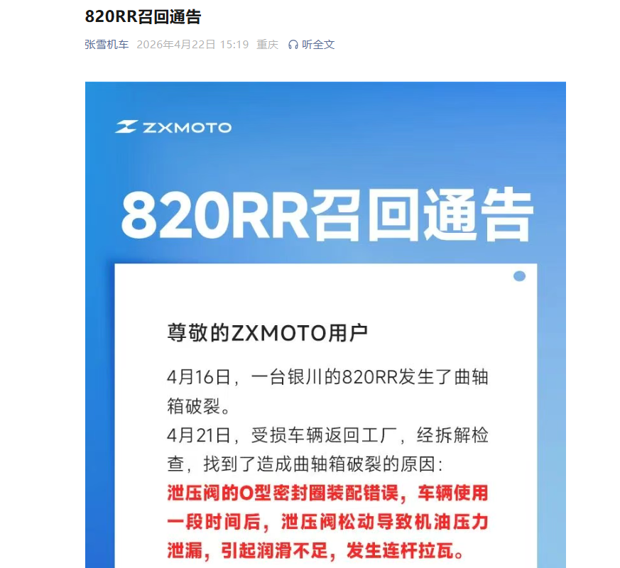 4月22日,张雪机车(ZXMOTO)发布《820RR召回通告》,宣布对已交付的820RR车型实施紧急召回。此时距离该车型4月3日正式下线、4月4日启动交付仅过去18天,成为国产高性能摩托车领域罕见的快速召回案例。